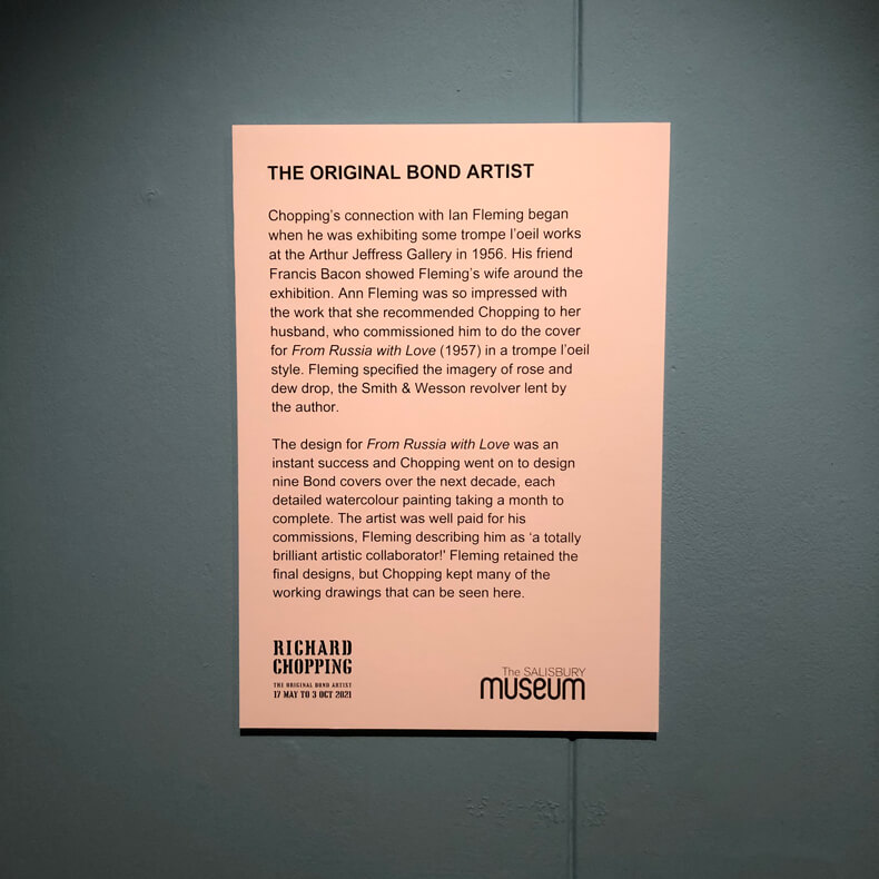 On Saturday 19th June, 2021, I made the journey to the Wiltshire city of Salisbury to visit the 'Richard Chopping - The Original Bond Artist' exhibition being held at Salisbury Museum. Richard Chopping was an accomplished artist, illustrator and author, but is perhaps best known for his trompe l'oeil covers for nine of the James Bond books by Ian Fleming. The exhbition, although small, covers Chopping's Bond work, but also showcases his career before and after the Fleming books. The exhibition runs until the 3rd October 2021 and is well worth a visit if you are in Salisbury. More details can be found on the Salisbury Museum website.