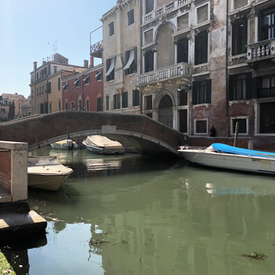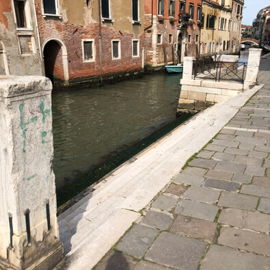The canal and bridge in Venice as featured in the boat chase in Moonraker. This is the canal where the lovers in the gondola narrowly miss 007 in the Bondola but then have their boat cut in half by the pursuing speedboat. Located just around the corner from the locations shown above. (Visited May 2018)