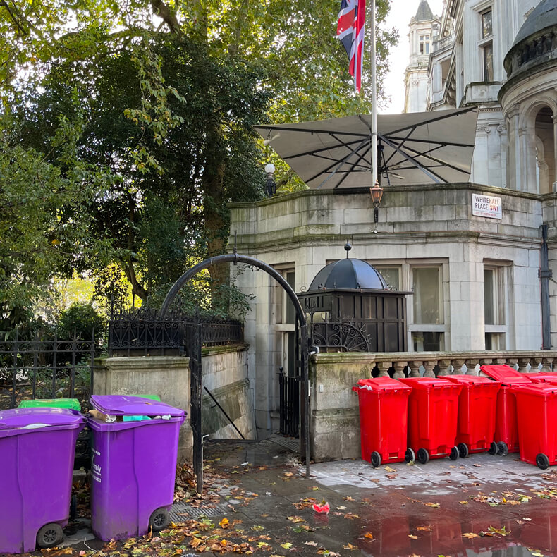 The rear entrance to the Liberal Club on Whitehall Place, London (opposite Embankment Station), as seen in Skyfall when Silva emerges from the London Underground and climbs into the police vehicle. (Visited October 2022)