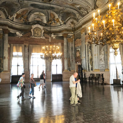 The ballroom of the Ca’Rezzonic in Venice as featured in Moonraker. This is the room that is used as Drax's office where Bond, M and Frederick Gray enter wearing gas masks. (Visited May 2018)