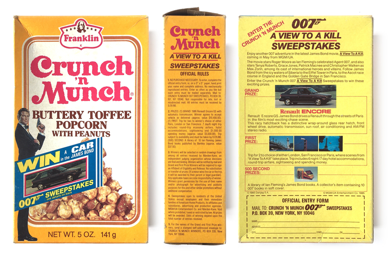 A View To A Kill Crunch 'n Munch box with sweepstakes competition to win a car (American Home Foods, US, 1984)