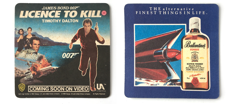 Licence To Kill and Ballatine's Scotch Whiskey promotional beermat (Warner Bros., US, c.1989)