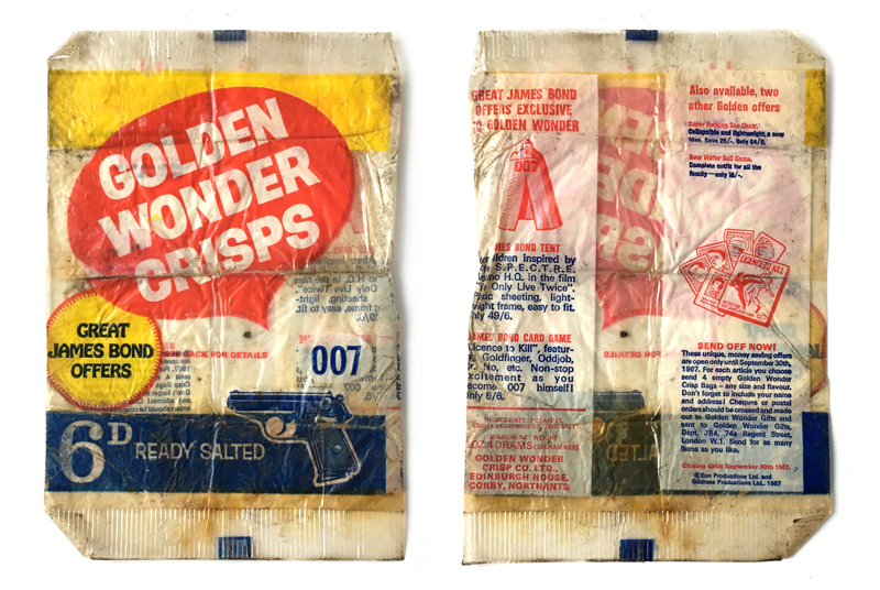 Promotional packet of Smiths Crisps with an offer to buy a James Bond tent of Licence To Kill card game - now I have the card game but I have never seen the tent! (Golden Wonder Crisp Co. Ltd., UK, 1967)