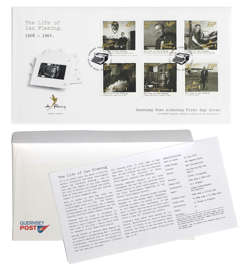 The Life of Ian Fleming first day cover of six stamps with envelope and info sheet (Guernsey Post, UK, 2014)