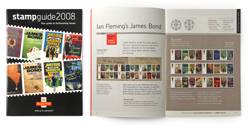 Stamp Guide 2008 booklet previewing the Royal Mail Ian Fleming Centenary stamps (Royal Mail, UK, 2008)