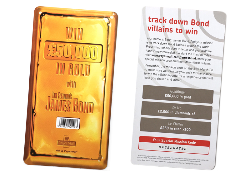 Royal Mail Ian Fleming Centenary stamps competition flyer in the shape of a gold bullion bar with the chance to win £50,000 (Royal Mail, UK, 2008)