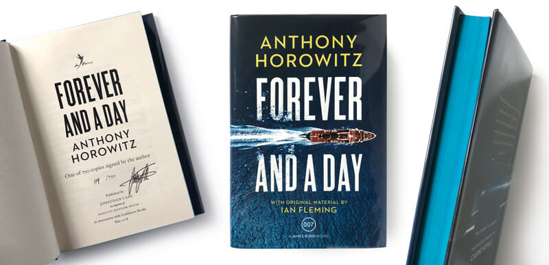 Number 119 of a limited edition of 750 Anthony Horowitz signed first editions of Forever And A Day with special blue page edges (Goldsboro Books/Jonathan Cape, UK, 2018)