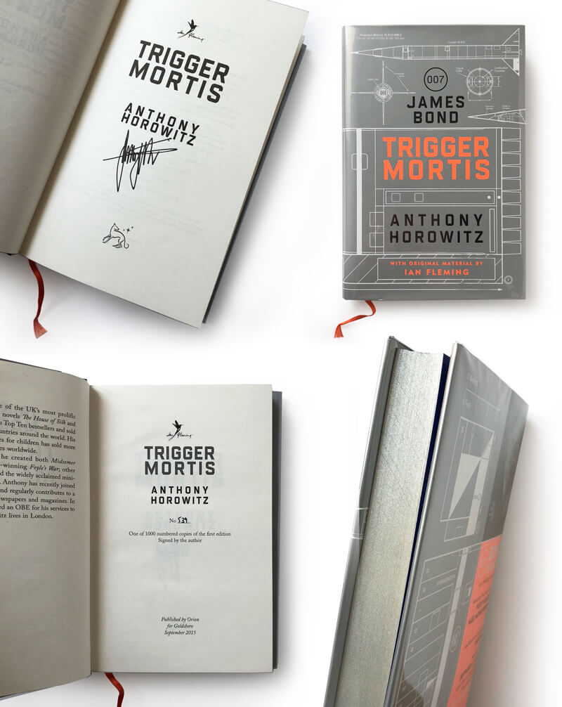 Number 539 of a limited edition of 1,000 Anthony Horowitz signed first editions of Trigger Mortis with special silver page edges (Goldsboro Books/Orion Books, UK, 2015)