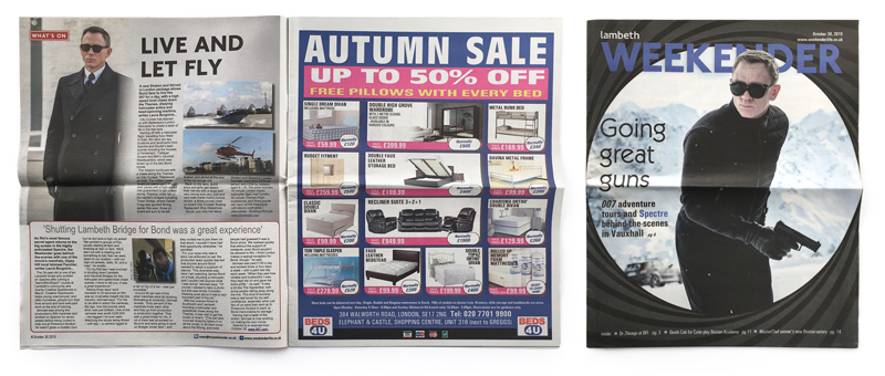Lambeth Weekender newspaper with Spectre cover and article (Southwark Newspaper Ltd., UK, 30th October 2015)