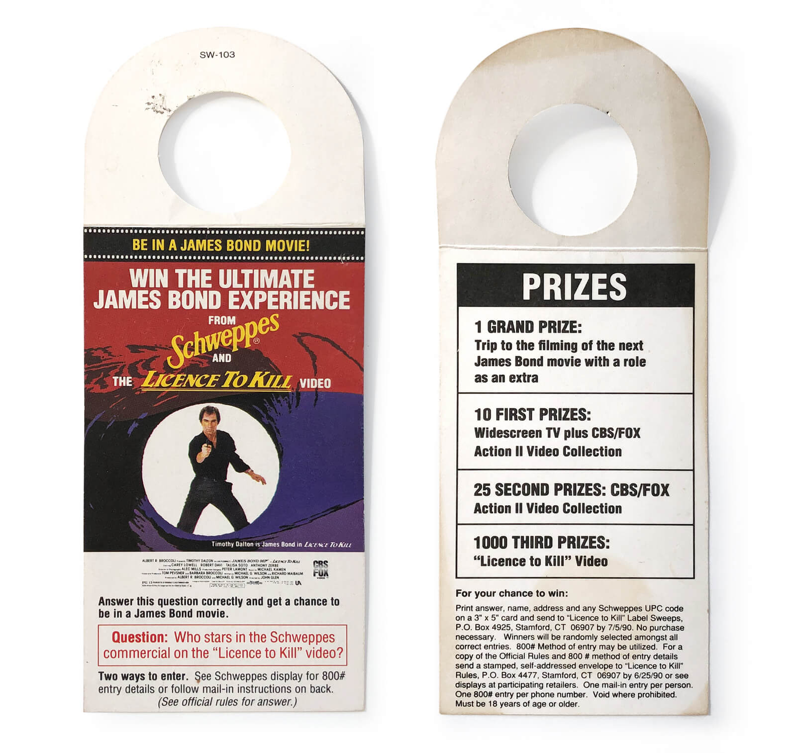 Licence To Kill Schweppes competition bottle tag (Schweppes, US, 1990)