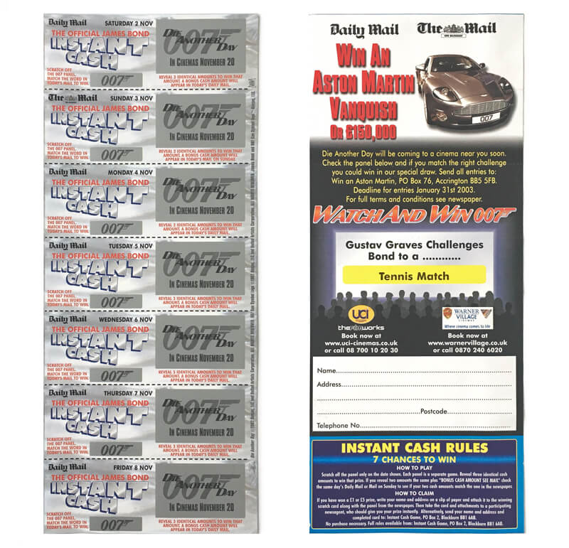 Die Another Day Daily Mail The Official James Bond Instant cash scratchcards (Daily Mail, UK, 2002)
