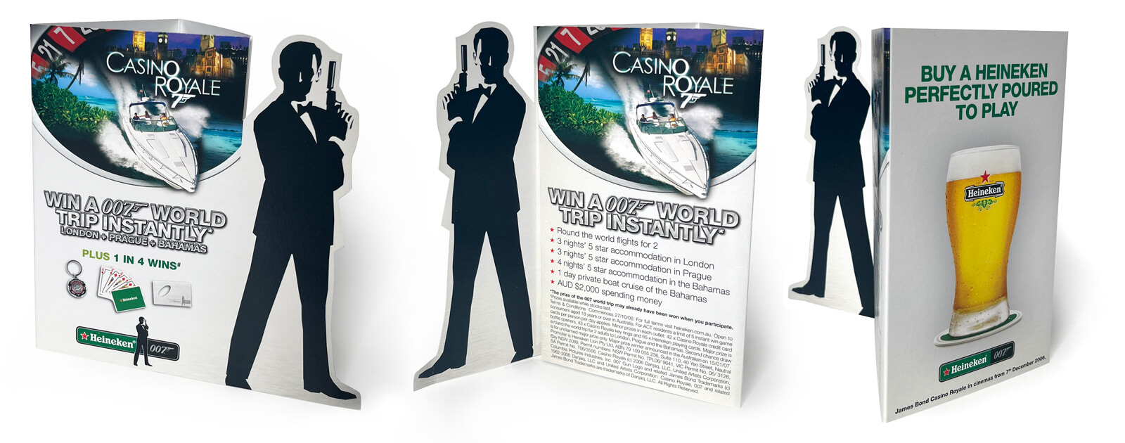 Small triangular countermdisplay stand for Heineken to promote their Casino Royale world trip competition (Heineken, Australia, 2006)