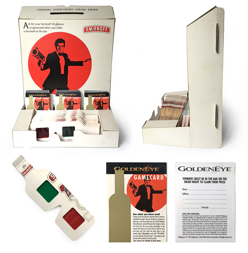 Smirnoff GoldenEye competition shop counter display stand with flyer and 3D glasses in the shape of a bottle (Smirnoff, UK, 1995)