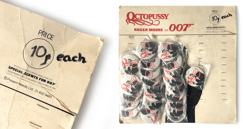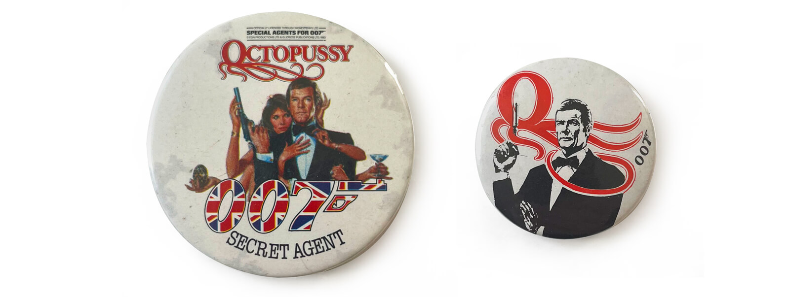 Octopussy 007 Secret Agent promo badge (left) and smaller version of the badges show on display card above (right) (Present Needs Ltd., UK, 1983)