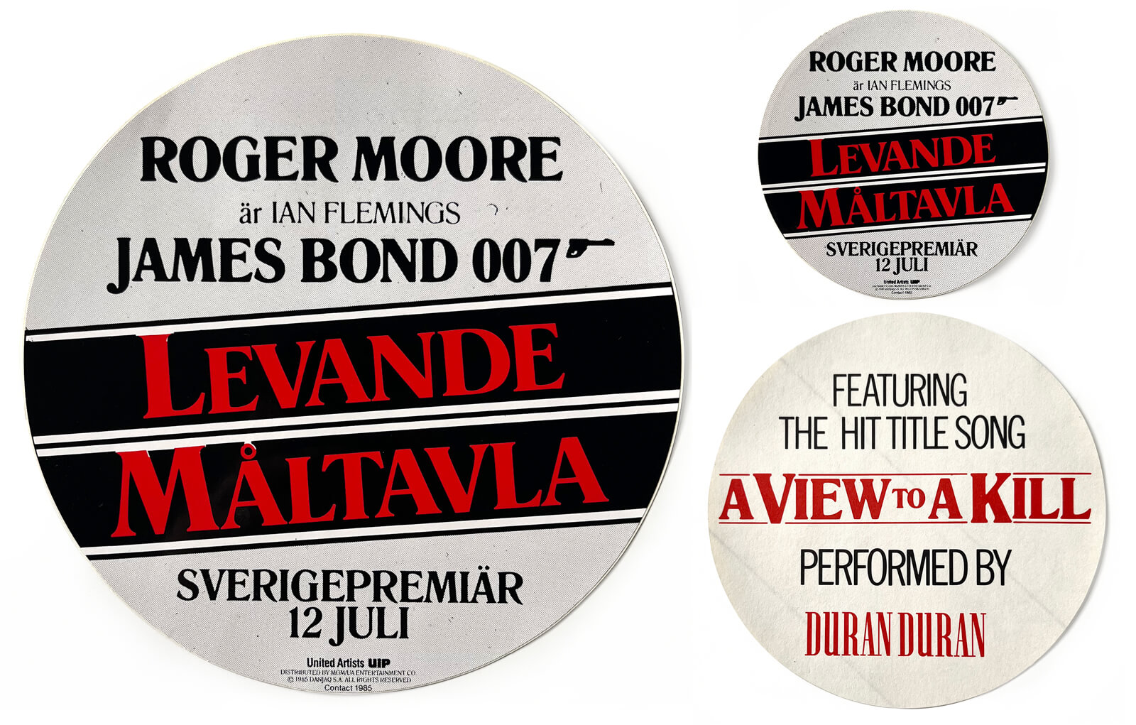 Series of Levande Måltavla (A View To A Kill) stickers promoting the film and Duran Duran theme song (United Artists, Sweden, 1985)