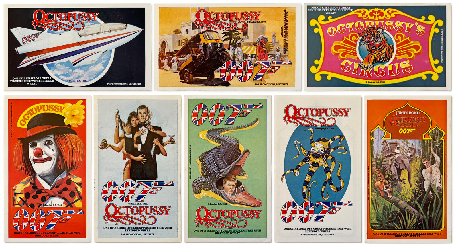 Set of eight Octopussy promotional stickers given away in boxes of Shredded Wheat cereal (Nabisco/P&P Promotions, UK, 1983)