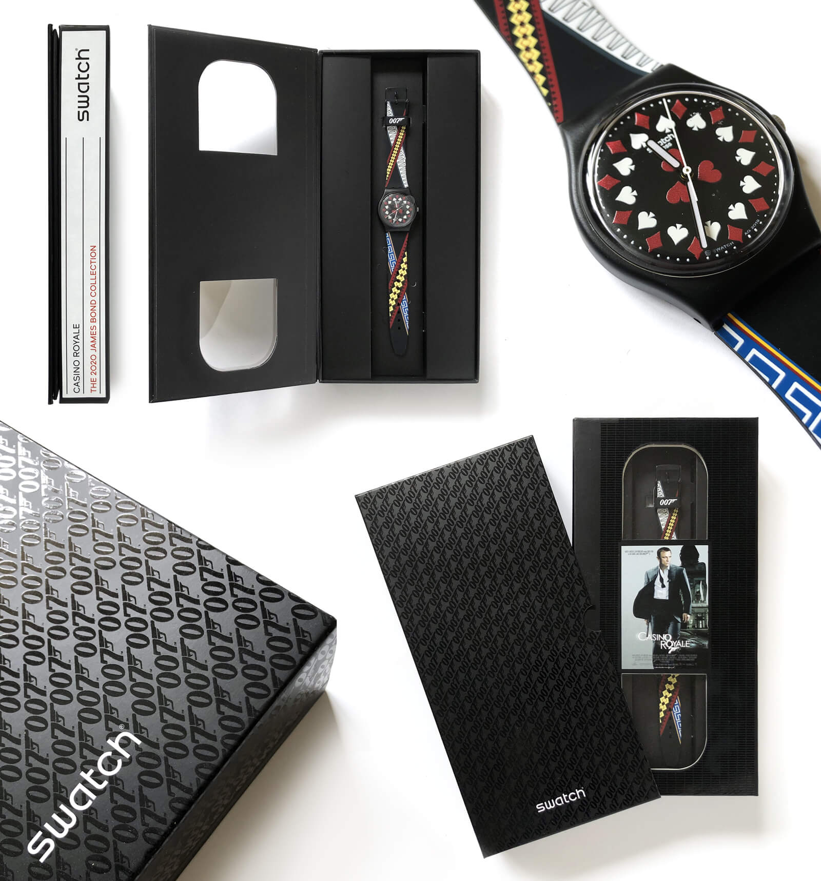 Casino Royale watch from the 007 x Swatch collection featuring a film from each of the actors to play James Bond (Swatch, Switzerland, 2020)